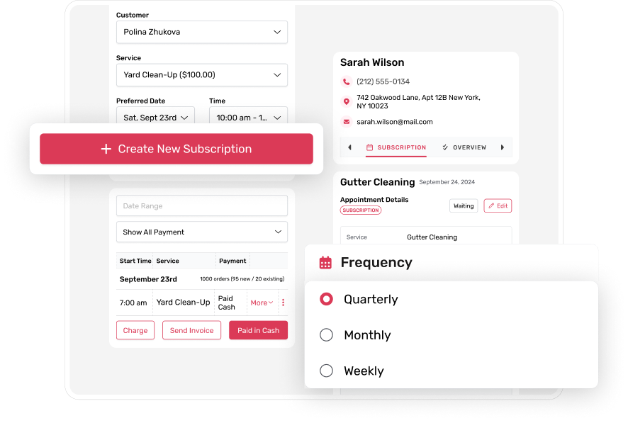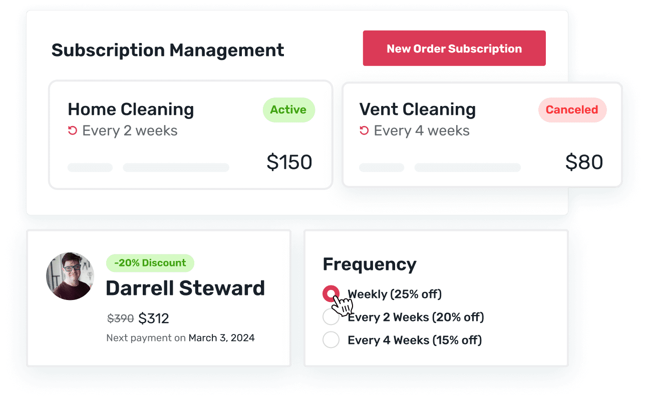 Allow customers to appointment from you on a weekly, bi-weekly or monthly basis. Or setup recurring payments based on the agreement.